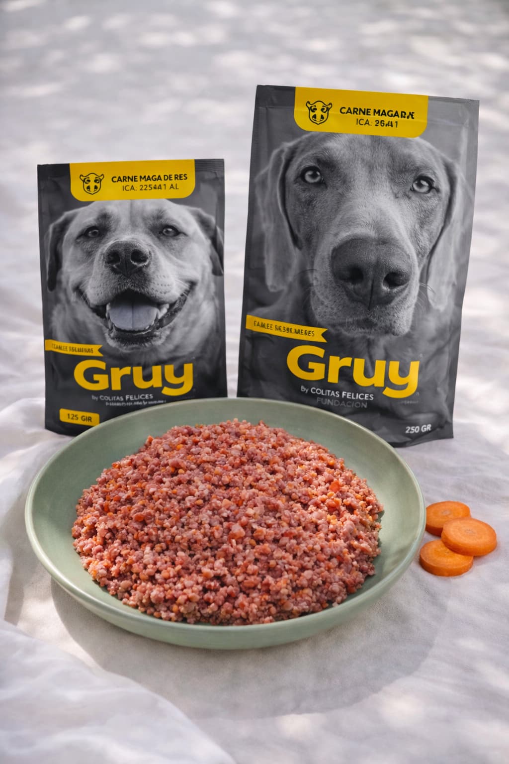 GRUY es la misma comida natural con la que alimentamos diariamente a más de 90 perros rescatados en nuestra Fundación Colitas Felices.